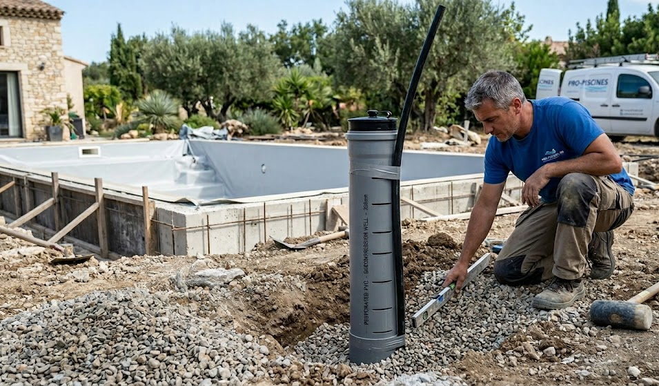 Le puits de décompression est un tube vertical, souvent en PVC perforé, installé à la verticale à proximité de votre piscine. Il permet de surveiller et de gérer le niveau d’eau du sol qui entoure la piscine, surtout en période de forte pluie ou durant des périodes d’hivernage. Lorsque la nappe phréatique est haute, l’eau entre dans le tube, ce qui avertit du danger de pression sur le liner.
